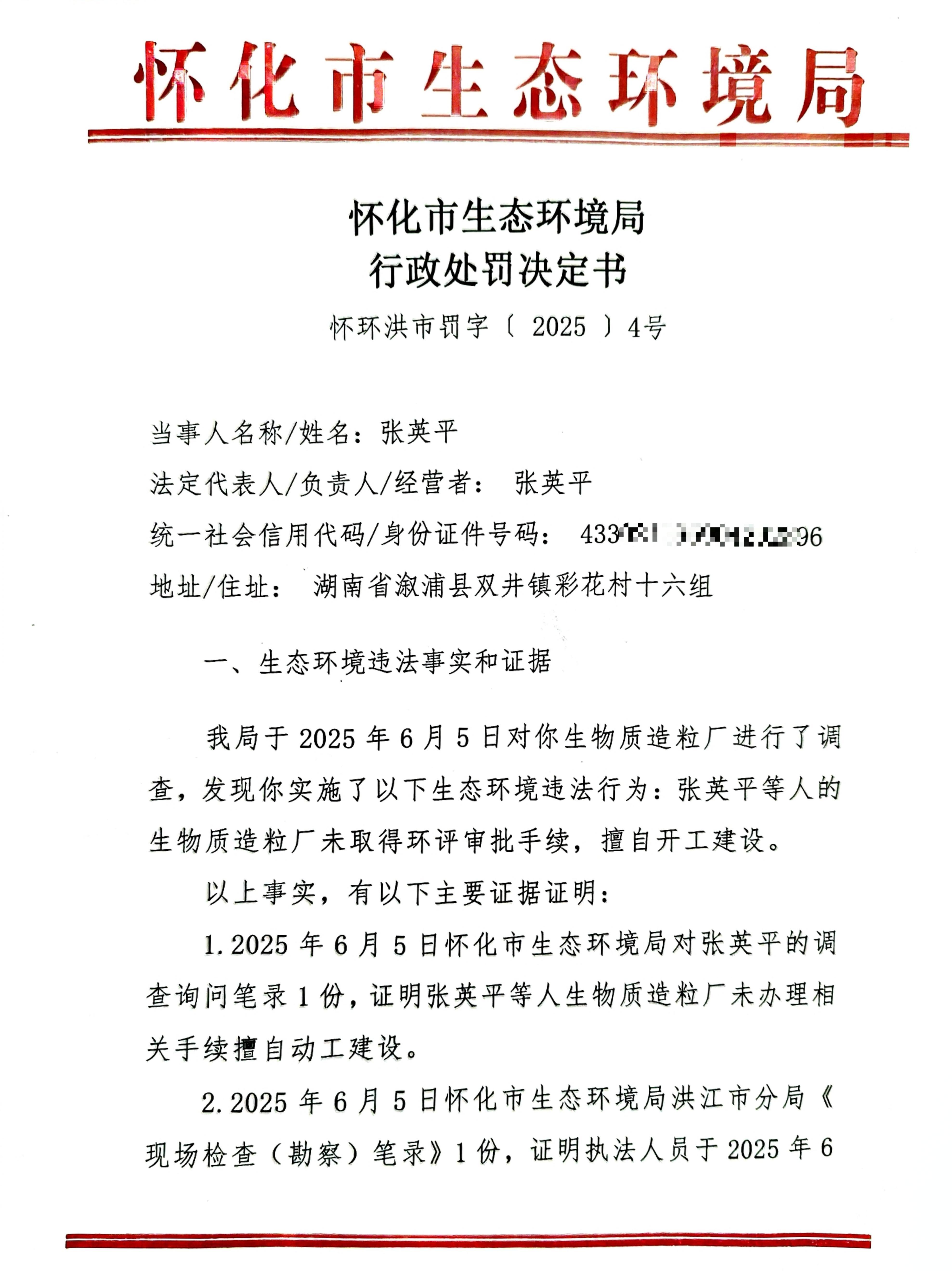 關于對張英平行政處罰決定書的公示(懷環洪市罰字〔2025〕4號)