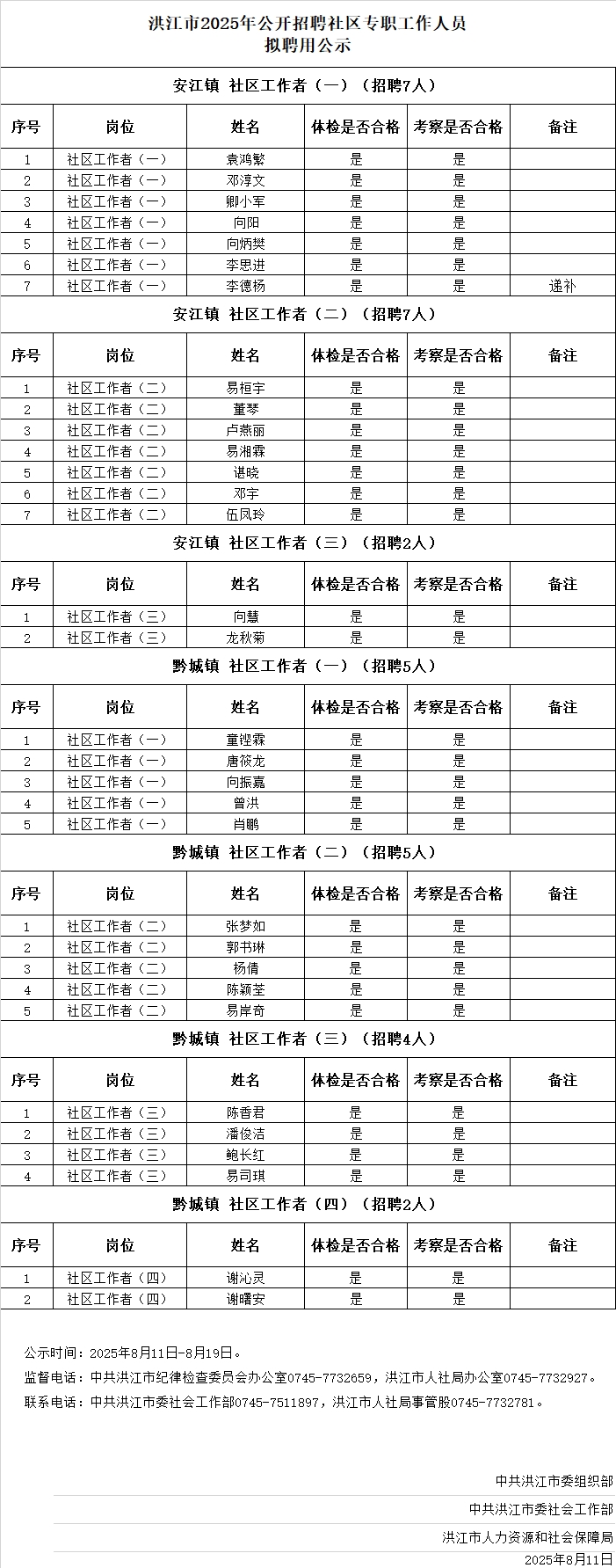 洪江市2025年公開招聘社區專職工作人員擬聘用公示