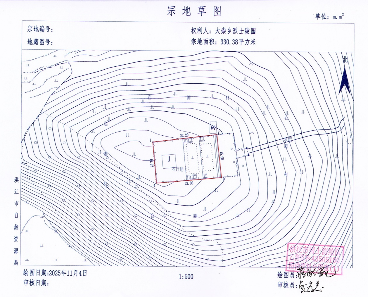 洪江市大崇鄉烈士陵園,該宗地坐落于大崇鄉巖腳村垴山頂,宗地面積為330.38平方米,現場指界確權,宗地權屬四至權利人皆簽字認可無異議。