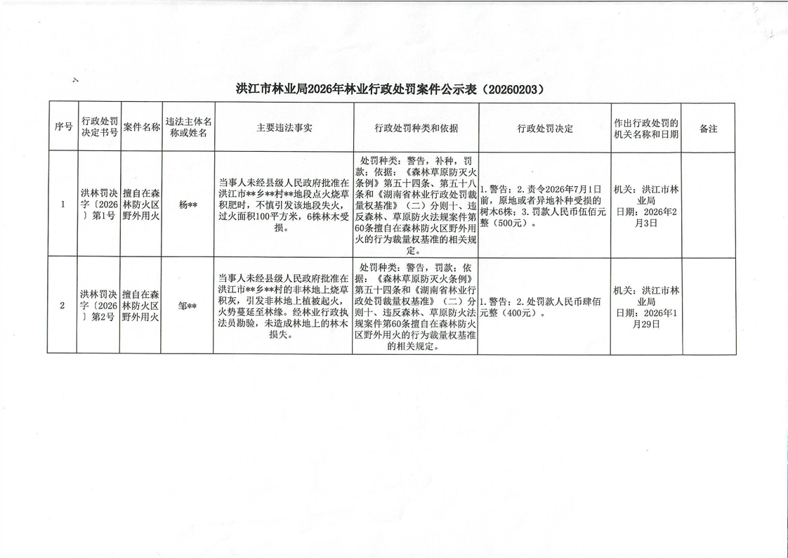 洪江市林業局2026年林業行政處罰案件公示表(20260203)