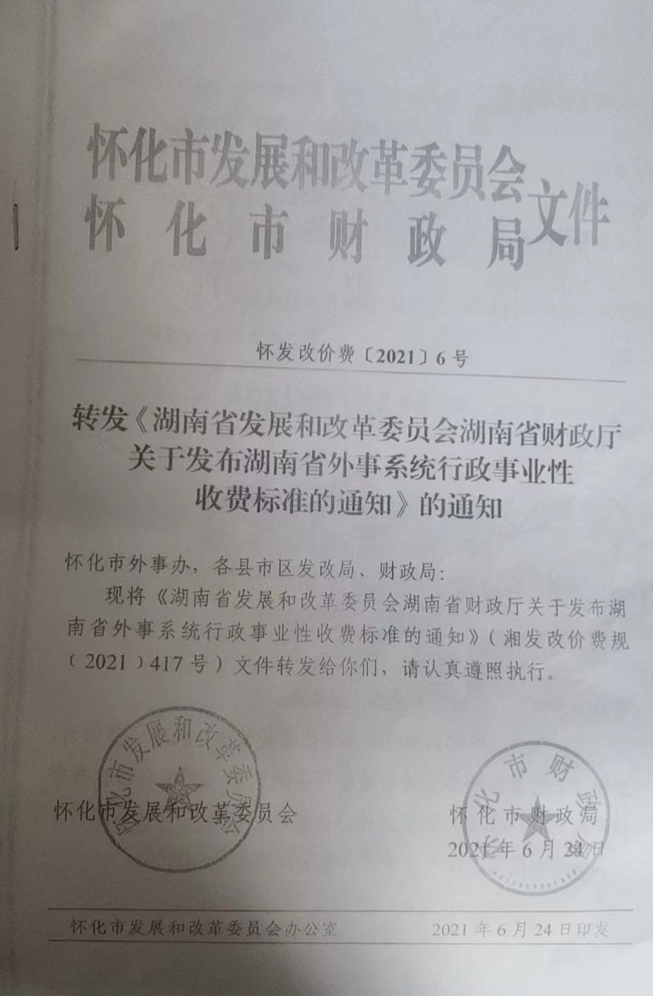 現將轉發《湖南省發展和改革委員會 湖南省財政廳關于發布湖南省外事系統行政事業性收費標準的通知》的通知(懷發改價費〔2021〕6號)文件轉發給你們,請認真遵照執行。
