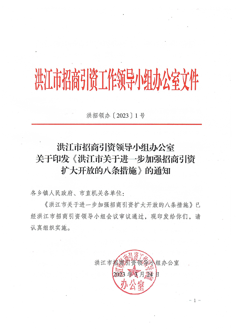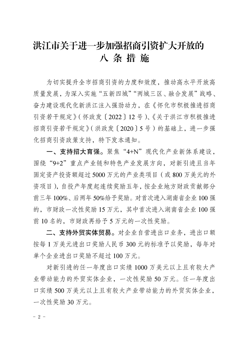 關于印發《洪江市關于進一步加強招商引資擴大開放的八條措施》的通知 洪招領辦〔2023〕1號