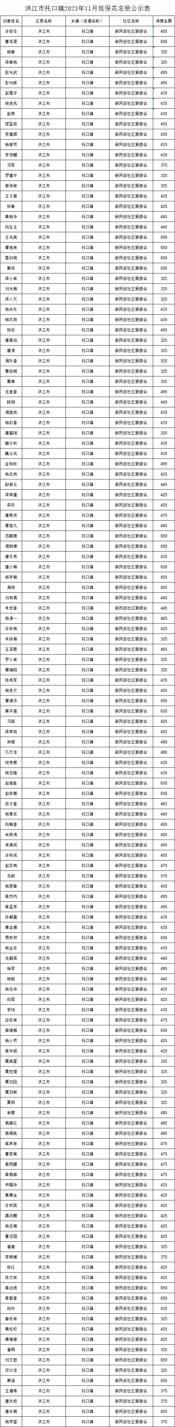 洪江市托口鎮2023年11月低保發放情況公示如下,因篇幅限制只顯示了城市低保發放表,詳情以附件形式附后,請自行下載查看。