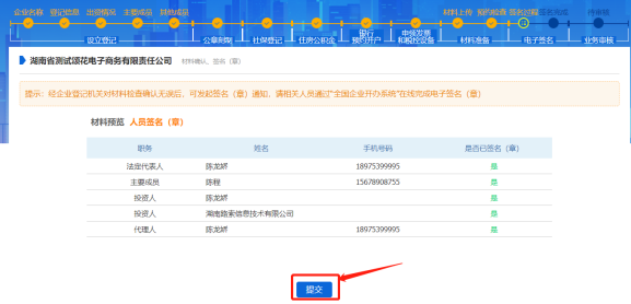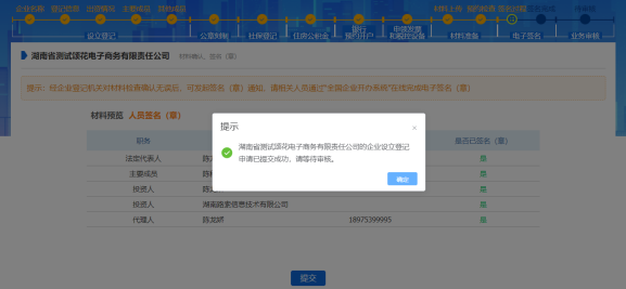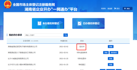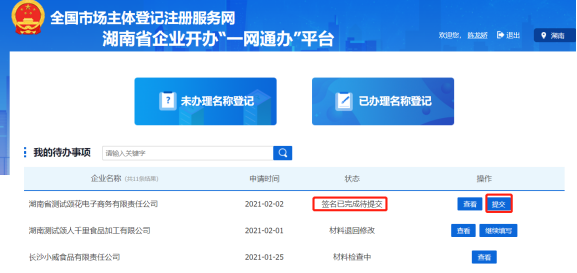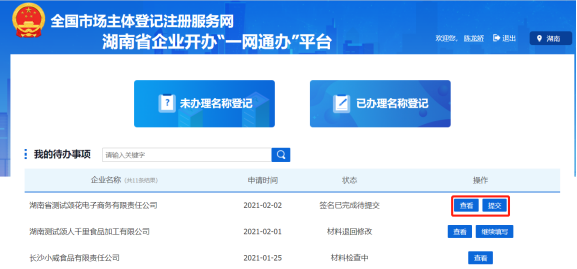 所有人都簽名完畢后,申請人登錄到企業開辦“一網通辦”平臺首頁,可以看到當前申請的狀態是“簽名已完成待提交”,點擊【提交】按鈕,可提交到企業注冊登記機關審核。