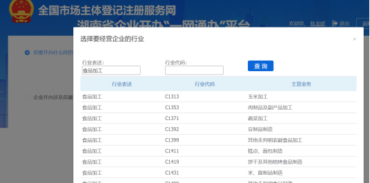 點擊【下一步】,進入企業經營范圍錄入頁面,點擊【選擇經營范圍】按鈕,彈出經營范圍規范化選擇頁面,輸入經營范圍文本,點【查詢】,可查出經營范圍標準化用語。