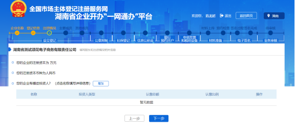 企業基本信息錄入完成,需要錄入投資人及其出資情況,注冊資本根據投資人出資情況自動累加。