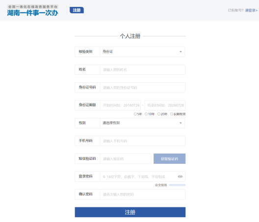 【注冊】首次登錄沒有賬號密碼,可以點擊【注冊】按鈕進行用戶注冊,錄入用戶姓名、身份證號碼、手機號碼等信息,信息驗證成功后即可完成注冊。