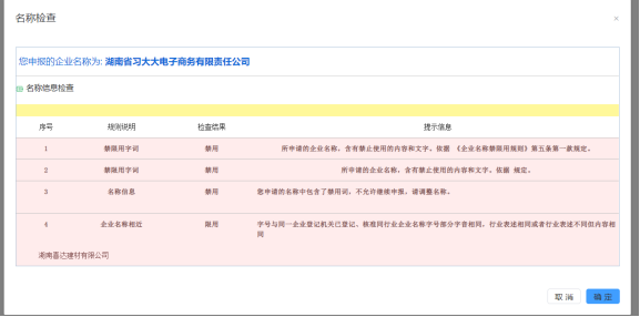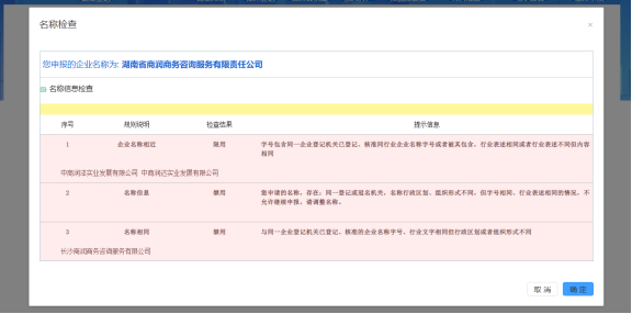若擬申報的名稱與同登記機關同行業已登記、核準的名稱存在相同或高度相似的情況,則系統會彈出禁止窗口,并列出禁止企業名稱。