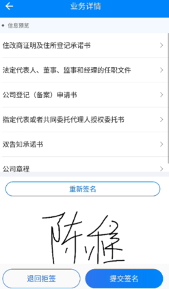 在代辦事項中可以看到從PC端提交過來的申請數據,顯示【待簽字】,點擊【待簽字】進入業務詳情,如右圖所示,點擊【查看】按鈕,可以預覽文書: