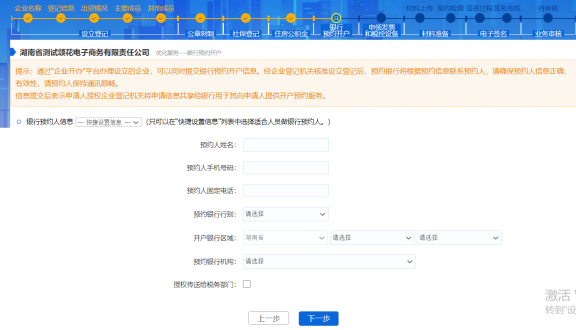 若在開始選擇具體辦理事項時勾選了銀行預約開戶,則需要錄入銀行預約開戶信息,主要是錄入預約人及開戶銀行信息,在錄入信息之前請仔細閱讀平臺提示信息。銀行預約開戶信息錄入完畢,點擊【下一步】按鈕,進入下一個事項信息錄入頁面。