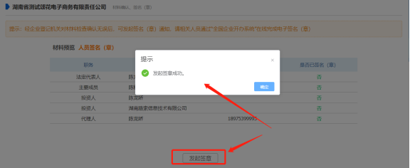 申請人收到檢查檢查通過的短信后,登錄企業開辦系統,點擊【發起電子簽名】按鈕,進入簽名名單確認頁面。