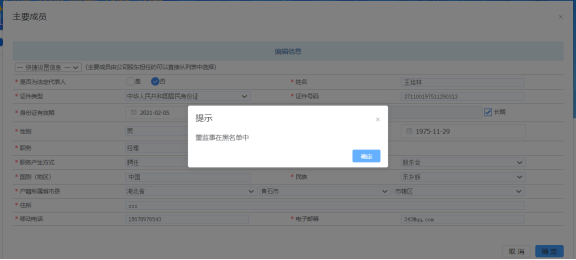 若主要成員在黑名單、一人有限公司、法院老賴等名單中,系統會對其進行檢查,限制其繼續辦理。