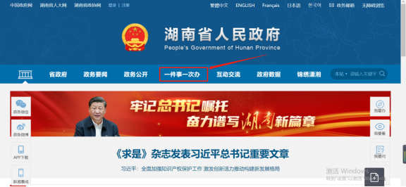 在IE瀏覽器地址欄中輸入“https://www.hunan.gov.cn/”進入“湖南省人民政府門戶網站”主界面(圖一所示),點擊頁面上【一件事一次辦】,進入一件事一次辦首頁,在特色服務區域中,找到【企業開辦‘一網通辦’平臺】(如圖二所示):