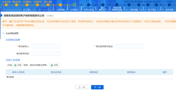 若在開始選擇具體辦理事項時勾選了社保登記,則需要錄入社保登記信息,主要是錄入社保單位信息和社保人員信息,在錄入信息之前請仔細閱讀平臺提示信息。社保登記信息錄入完畢,點擊【下一步】按鈕,進入下一個事項信息錄入頁面。