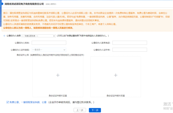 若在開始選擇辦理具體事項時,勾選了公章刻制,則需要錄入公章刻制信息,主要是錄入公章經辦人信息和公章刻制信息。在錄入信息之前仔細閱讀平臺中的提示信息。