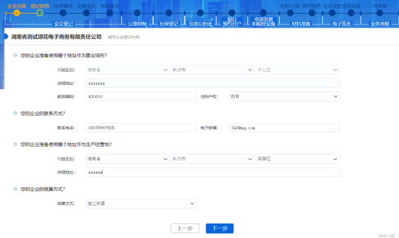 經營范圍確定后,點擊【下一步】按鈕,繼續填寫企業經營場所、聯系方式、生產經營地和核算方式等。