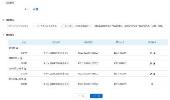 其他成員信息全部錄入完畢后,則代表所有注冊登記信息填寫完成,若在開始選擇企業開辦申請事項時,勾選了需要辦理公章、社保登記、住房公積金、銀行預約開戶、申領發票等其他部門事項,則點擊【下一步】按鈕后,將需要繼續填寫其他事項地的信息。