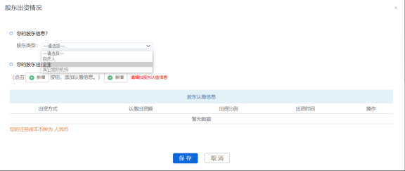 點擊【添加】按鈕,彈出股東出資情況添加頁面,選擇股東類型(自然人、企業或其他組織機構),若投資人是自然人,則股東類型選自然人;若投資人是企業,則股東類型選企業;若是其他單位或機構,則股東類型選擇其他組織機構。
