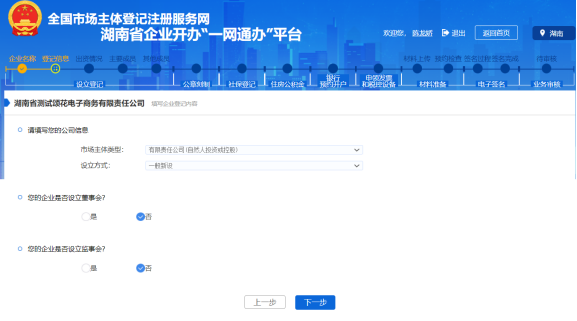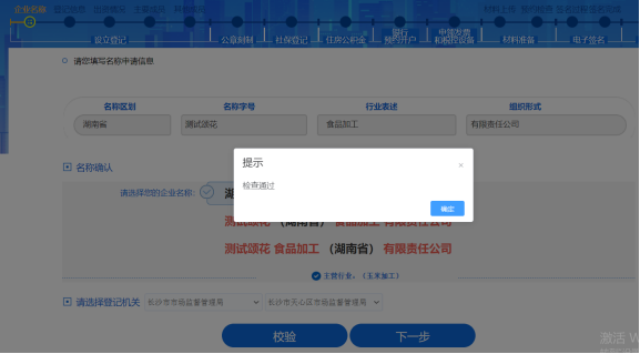 若彈出校驗通過的提示信息,則說明名稱可用,點擊【下一步】即可進入設立登記環節。
