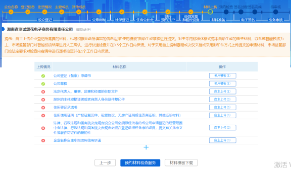所有的資料全部上傳完畢后,點擊【預約材料檢查服務】按鈕,提交申請至登記機關檢查。申請人等待登記機關的檢查結果,登記機關對該業務申請資料檢作出處理后,會有短信告知申請人,申請人需注意接收短信。