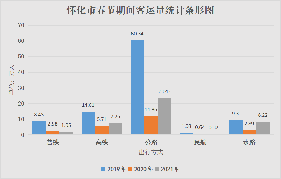 春節假期期間,懷化市綜合交通發送旅客41.18萬人,同比2020年上升74.02%,同比2019年下降61.1%。其中普鐵1.95萬人,同比2020年下降24.31%,同比2019年下降76.86%;高鐵7.26萬人,同比2020年上升27.22%,同比2019年下降50.32%;公路23.43萬人,同比2020年上升102.16%,同比2019年下降61.17%;水路8.22萬人,同比2020年上升184.92%,同比2019年下降11.62%;芷江機場3165人,同比2020年下降50.07%,同比2019年下降69.41%。受疫情影響,今年春節期間群眾出行旅游大幅減少,大部分市民選擇在懷就地過年,高速公路偶有堵塞現象,公路、水路客流量有所回暖,但未達到正常水平,部分普鐵線路停運,往年最熱鬧的高鐵客流量也有所減少。全市春運總體平穩、安全、有序。(市春運辦 劉二華)