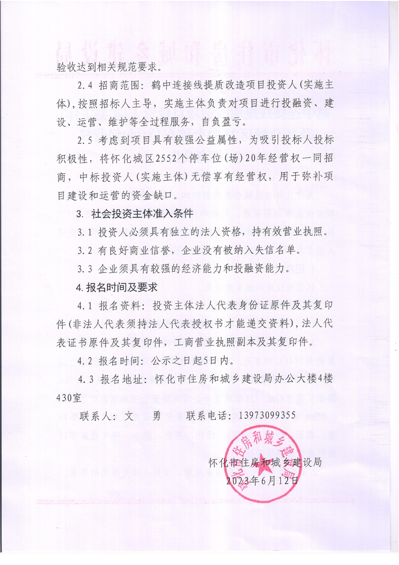 鶴中連接線提質改造項目投資人(實施主體)及懷化城區2552個停車位(場)經營權招商公告