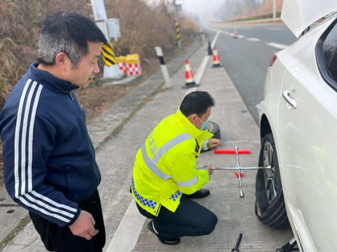 春運第一天,高速公路上車流量明顯增加,懷化西管理所巡查人員江揚、于楓起了個大早,開始了一天的巡查工作。9時許,巡查至G65包茂高速懷化段K2187南往北時,發現一輛小車因右后輪爆胎停在緊急停車帶。由于駕駛員沒有換胎經驗,正焦急地站在車旁,手足無措。巡查人員了解情況后,立即用隨車維修工具幫助司機更換輪胎,不到5分鐘就將備胎換上,幫助駕駛員再次踏上旅途。